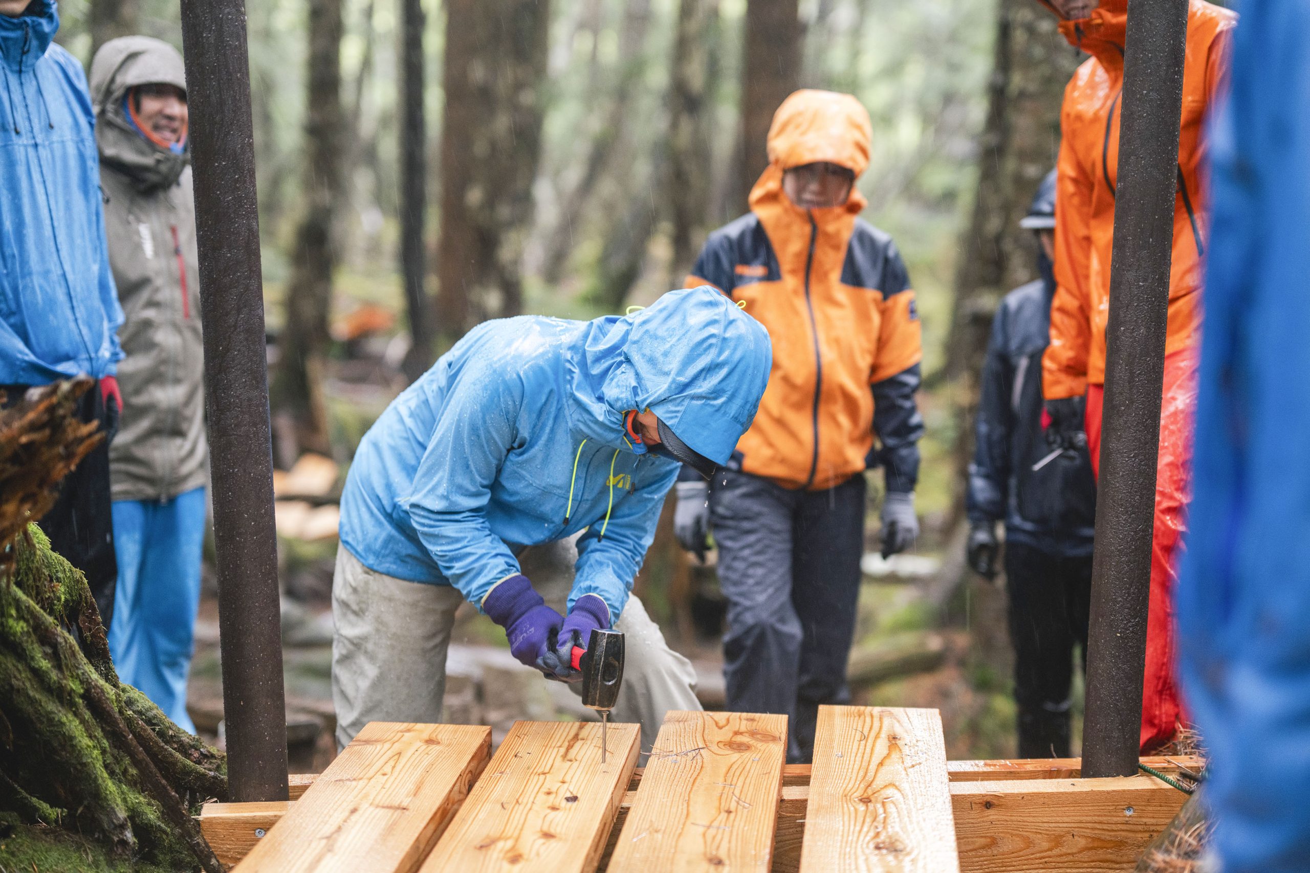 2025年6月に実施された白駒池登山道整備活動には、八ヶ岳観光協会に加盟している周辺の山小屋関係者、八ヶ岳観光協会とパートナーシップ協定を結んでいるアウトドアメーカー「ミレー・マウンテン・グループ・ジャパン株式会社」からボランティア社員12名、女優でモデルの一双麻希さんらが参加しました。当日は白駒池駐車場に集合し、八ヶ岳観光協会の山浦宣伝対策委員長による挨拶と作業の進行についての説明を受けた後、木道整備に使用する木材を運搬車で青苔荘前まで運びました。しかし、運搬車が使えるのはここまで。ここから先は強風と強い雨が降りしきる悪天候の中、人力での作業になり、参加者は雨で湿って余計に重くなった木材を肩に背負って現場へと運び、関係者の指導のもと木道の修理を行うなど、ハードな作業に熱心に取り組みました。