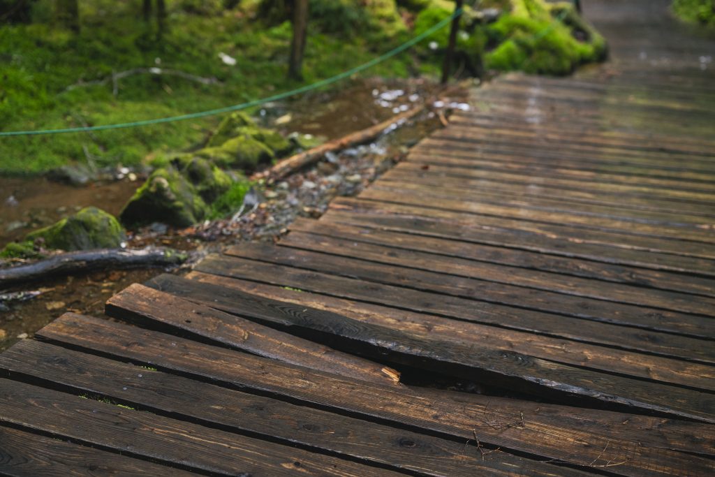 山浦清さんが作った木道も年月を経て補修が必要な箇所が増えていく中、古い板の張り替えを始めた青苔荘3代目主人・山浦雄大さん。