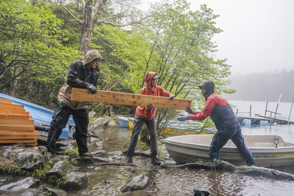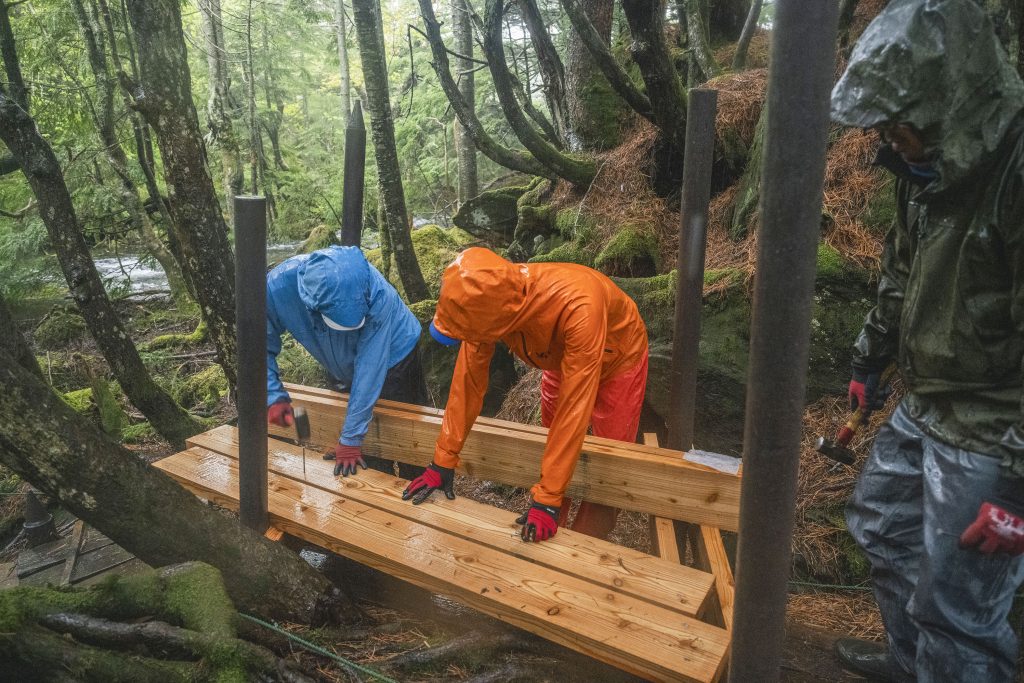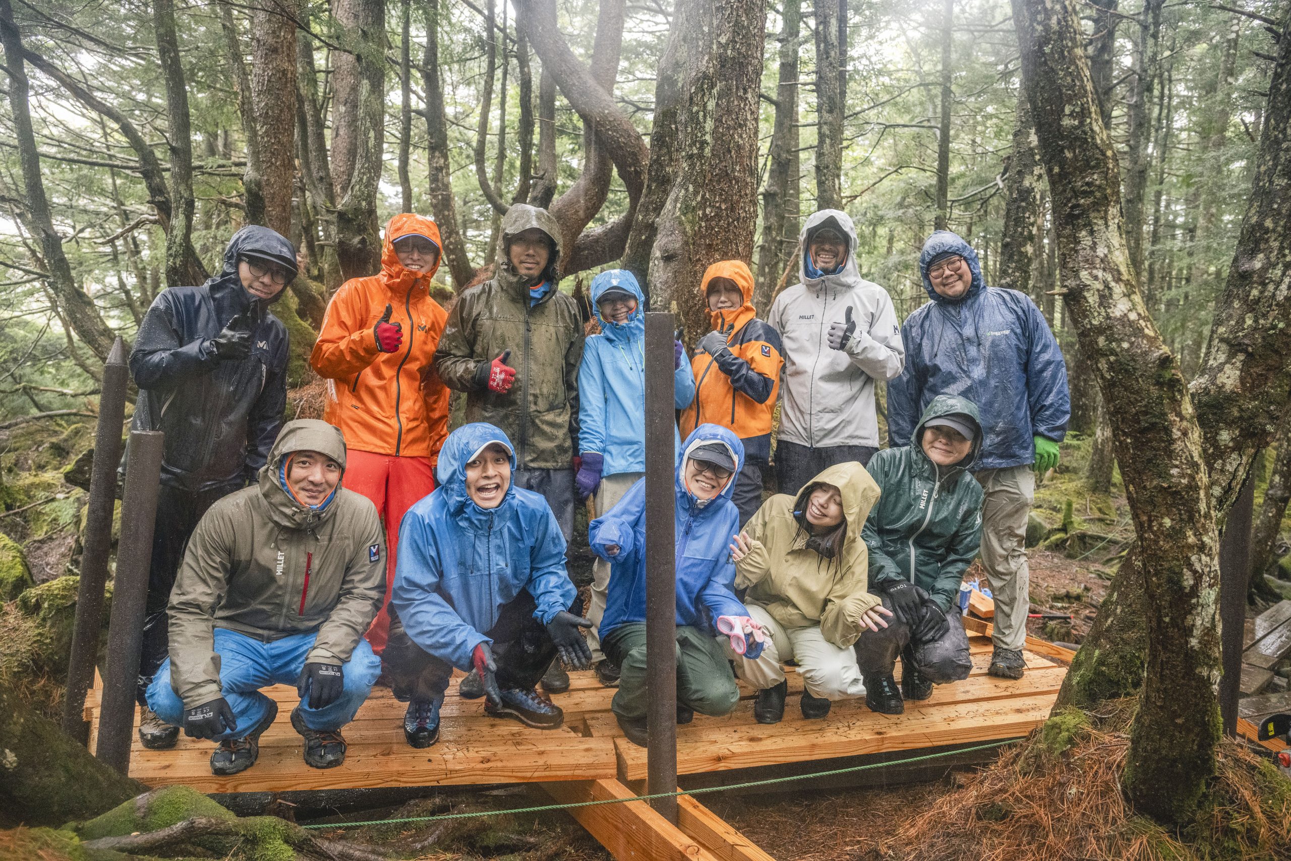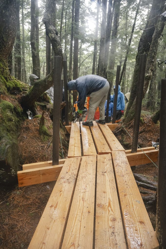 今回ミレーさんにお声がけをしたところ、ぜひ参加したいとご快諾いただき、社員研修という名目で有志の方々が作業に当たってくれることになり、いつもより大きな規模で登山道整備をすることができました。父が木道整備を始めてから30年、試行錯誤の連続だったであろうと思います。ですが景観を損なわないように木を使ったことで、そこにまた新たな苔が生えてきている様子などを見ると、やはり白駒池にはこのやり方が合っていたのだろうと思います。